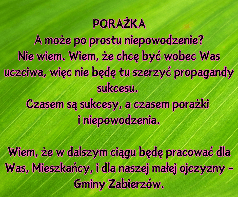 Nie wiem. Ale wiem, że winna jestem Wam, Mieszkańcy, uczciwość, a nie opowieści z mchu i paproci, że moja praca radnej to same sukcesy i radosne chwile. Czasem jednak coś się nie udaje, mimo szczerych chęci.