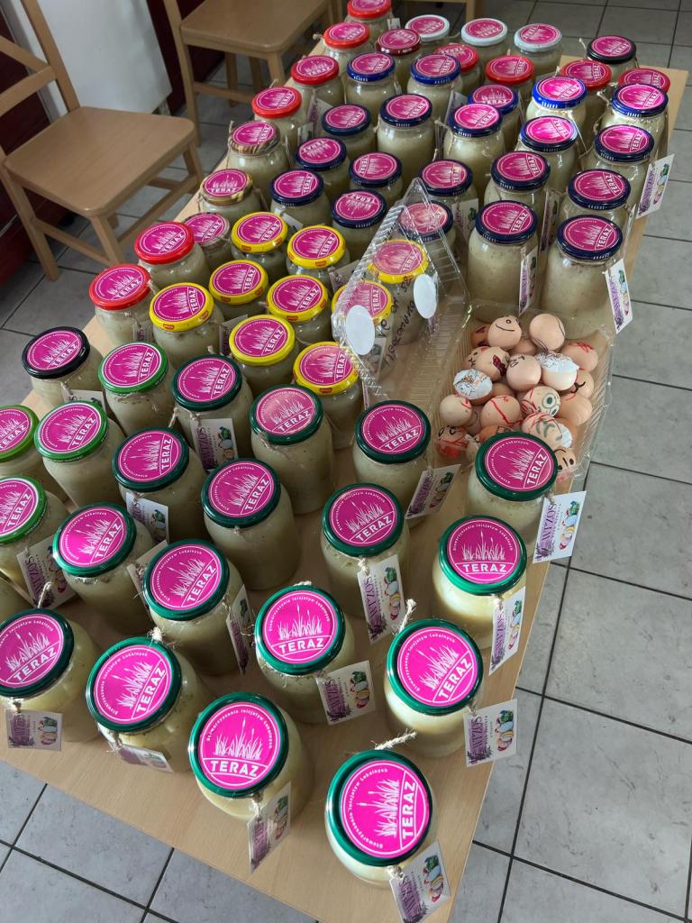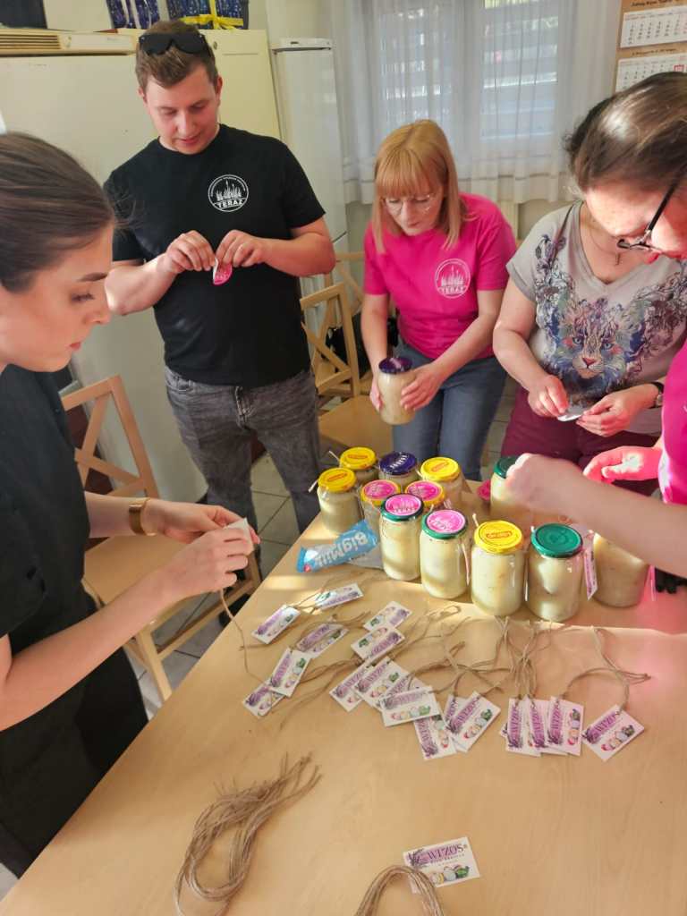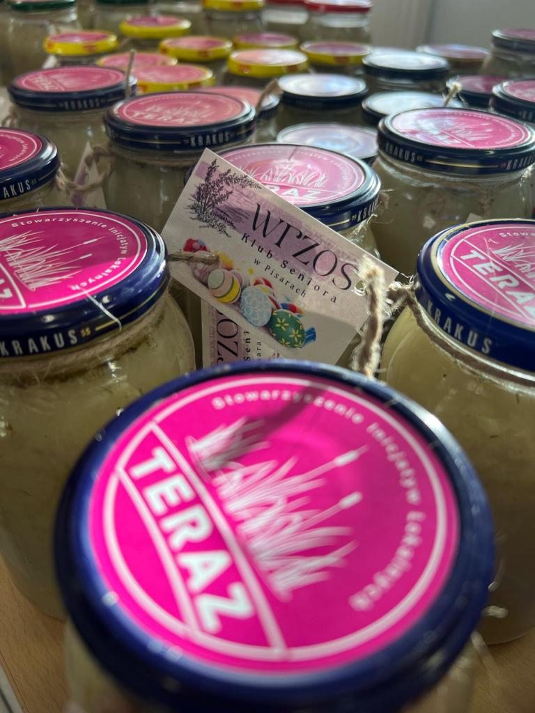 O szesnastej znów zameldowałam się w Pisarach i – tym razem z pozytywnymi ludźmi ze Stowarzyszenia TERAZ – przystąpiłam do rozlewania gotowego żurku do słoików, naklejania na wieczka naklejek i wiązania sznureczków z wizytówką Klubu Seniora „Wrzos”.